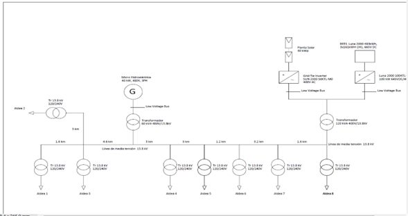 Le système de production d’énergie hybride proposé se compose de deux éléments : une petite centrale hydroélectrique qui produira 40 kW et un champ de production photovoltaïque de 60 kW qui doit être soutenu par des batteries qui seront chargées par les deux types de production d’énergie.  Le système produira un total de 100 kW, avec une demande actuelle de 35 kW et une demande future sur 20 ans de 62 kW.