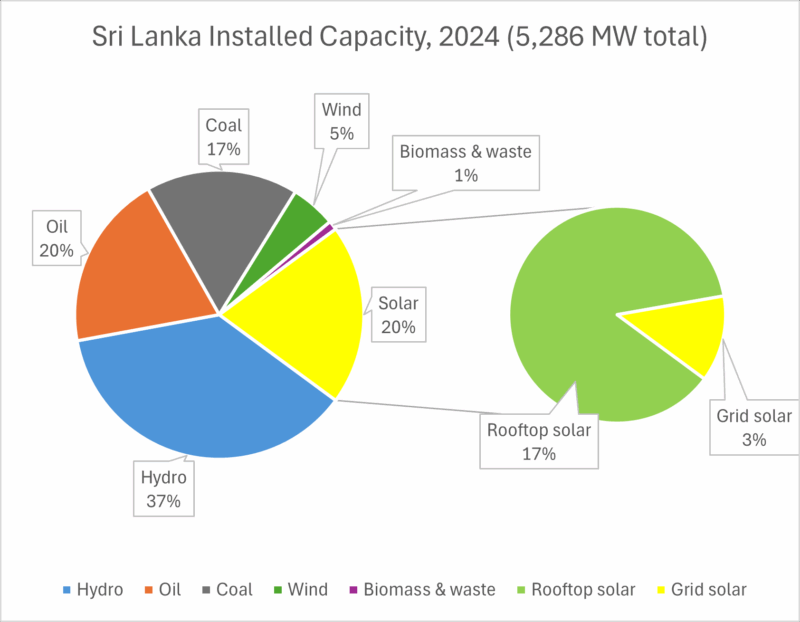 Source des données : Ceylon Electricity Board | Le Sri Lanka reste dépendant des combustibles fossiles pour une grande partie de sa production d’électricité, mais la croissance de la capacité solaire photovoltaïque en toiture accélère la transition écologique.