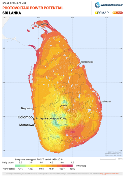 © The World Bank, Source: Global Solar Atlas 2.0, Solar resource data: Solargis / CC BY 4.0 https://commons.wikimedia.org/wiki/File:Sri-Lanka_PVOUT_Photovoltaic-power-potential-map_GlobalSolarAtlas_World-Bank-Esmap-Solargis.png