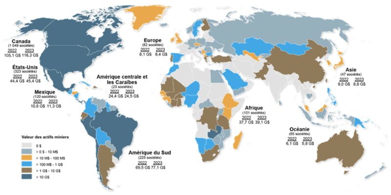 Au Canada, les répercussions négatives des projets extractifs touchent de façon disproportionnée les communautés autochtones, car ces projets sont souvent construits sur ou à proximité de leurs terres. Ce phénomène ne se limite pas aux frontières canadiennes : les sociétés minières canadiennes reproduisent ces inégalités partout dans le monde. En effet, l’exploitation minière est un pilier central de la stratégie canadienne en matière d’investissements étrangers et, en 2023, les actifs miniers canadiens à l’étranger totalisaient 220,4 milliards de dollars.